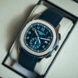 The Patek Philippe 5968G Aquanaut Blue Dial is a stunning timepiece that blends sporty aesthetics with luxurious craftsmanship. Housed in an 18k white gold case, this model features a striking blue dial with the signature Aquanaut pattern, complemented by luminescent hands and markers for enhanced readability. The chronograph function adds a layer of functionality, driven by the meticulously crafted self-winding movement that is visible through the sapphire crystal case back. Paired with a matching blue composite strap, the 5968G epitomizes Patek Philippe's mastery in creating versatile watches that are both elegant and robust, making it a prized possession for collectors.