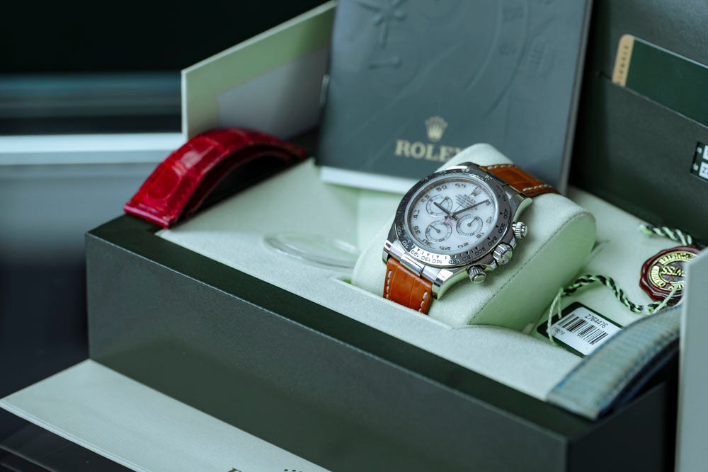 This Rolex Daytona 116519 (White Gold with Pink MOP Dial) has been meticulously examined for precision, functionality, and overall condition at our boutique in Cardiff, South Wales.
