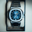 The Patek Philippe 5726/1A-014 is a distinguished timepiece that embodies the brand's commitment to luxury and precision. This model, part of the iconic Nautilus collection, features an annual calendar and moon phase complication, showcasing Patek Philippe's horological expertise. Crafted from stainless steel, it boasts a sleek blue dial with horizontal embossing, which elegantly contrasts with the luminescent hands and hour markers. The 5726/1A-014 is not only a symbol of refined craftsmanship but also a functional masterpiece, requiring adjustment only once a year and providing a sophisticated blend of style and practicality.